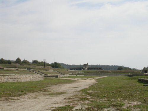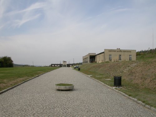 Das Lagergelände Durch diesen zaun gab es kein Entkommen Blick zum Lagereingang zurück